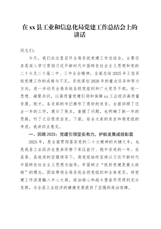 在 xx 县工业和信息化局党建工作总结会上的讲话同志们:今天,我们在这里召开全局系统党建工作总结会,主要任务是深入学习贯彻习近平新时代中国特色社会主义思想和党的二十大及二十届二中、三中全会精神,全面总结 2025...