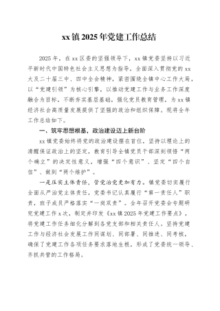 xx 镇 2025 年党建工作总结2025 年,在 xx 区委的坚强领导下,xx 镇党委坚持以习近平新时代中国特色社会主义思想为指导,全面深入贯彻党的 xx大及二十届三中、四中全会精神,紧密围绕全镇中心工作大局,以“党建引领”为核心...