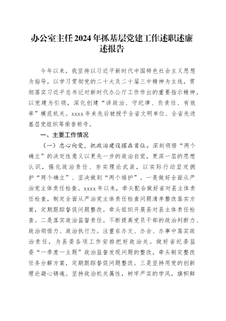 办公室主任 2024 年抓基层党建工作述职述廉述报告今年以来,我坚持以习近平新时代中国特色社会主义思想为指导,以学习贯彻党的二十大及二十届三中精神为主线,贯彻落实习近平总书记对新时代办公厅工作作出的重要指示精...