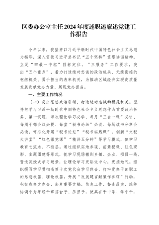 区委办公室主任 2024 年度述职述廉述党建工作报告今年以来,我坚持以习近平新时代中国特色社会主义思想为指导,深入贯彻习近平总书记“五个坚持”重要讲话精神,立足“四最一中枢”目标定位,“三服务”工作要求,突出...