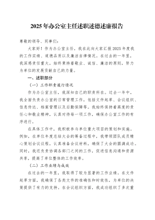 2025 年度区办公室主任述职报告2025 年,在区委、区政府的坚强领导下,在分管领导的悉心指导和各部门单位的大力支持下,我始终坚持以习近平新时代中国特色社会主义思想为指导,深入学习贯彻党的二十大及二十届三中、四...