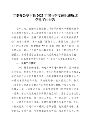 市委办公室主任 2025 年述职述廉述党建工作总结2025 年,在市委坚强领导下,我坚持以习近平新时代中国特色社会主义思想为指导,深入学习贯彻党的二十大及二十届三中、四中全会精神,全面落实习近平总书记关于办公厅工作...