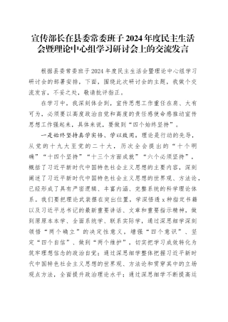 宣传部长在县委常委班子 2024 年度民主生活会暨理论中心组学习研讨会上的交流发言根据县委常委班子 2024 年度民主生活会暨理论中心组学习研讨会的部署安排,下面,围绕此次研讨会的主题,我做个交流发言,不妥之处,敬请...