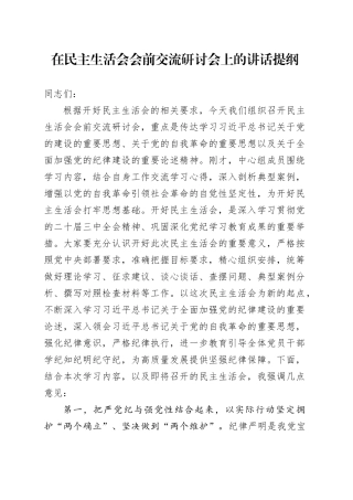 在民主生活会会前交流研讨会上的讲话提纲同志们:根据开好民主生活会的相关要求,今天我们组织召开民主生活会会前交流研讨会,重点是传达学习习近平总书记关于党的建设的重要思想、关于党的自我革命的重要思想以及关...
