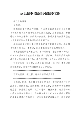 xx 县纪委书记在乡镇纪委工作会议上的讲话同志们:根据县纪委年度工作安排,今天我们在这里召开全县乡镇(街道)纪(工)委书记工作汇报交流会,主要目的是,希望通过对今年上半年工作的进一步交流,推动大家站在更高...