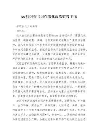 xx 县纪委书记在深化政治监督工作推进会议上的讲话同志们:这次会议的主要任务是学习贯彻 xxx 总书记关于“要强化政治监督,确保完整、准确、全面贯彻新发展理念”重要讲话精神,深入贯彻落实《中共中央关于加强党的政...