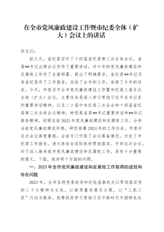 2024 年在党风廉政建设工作暨市纪委会议上的讲话同志们:前几天,省纪委召开了十四届省纪委第三次全体会议,省委××书记出席会议并作了重要讲话,对今年的党风廉政建设和反腐败工作作了全面部署、提出了明确要求,省纪...