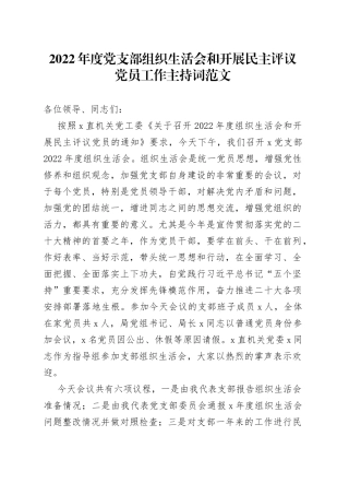 2022 年度党支部组织生活会和开展民主评议党员工作主持词范文各位领导、同志们:按照 x 直机关党工委《关于召开 2022 年度组织生活会和开展民主评议党员的通知》要求,今天下午,我们召开 x 党支部2022 年度组织生活会。组...