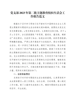 党支部 2023 年第二批主题教育组织生活会工作报告范文根据关于召开学习贯彻习近平新时代中国特色社会主义思想主题教育专题组织生活会的相关通知精神,按照机关党总支有关部署安排,x 党支部结合实际,认真制定总体方案...