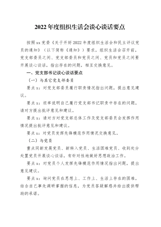 2022 年度组织生活会谈心谈话要点按照 xx 党委《关于开好 2022 年度组织生活会和民主评议党员的通知》(以下简称《通知》)要求,组织生活会召开前,党支部委员之间、党支部委员和党员之间、党员和党员之间要开展谈心谈话...