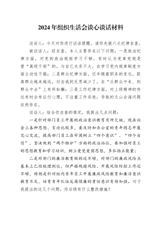 2024 年组织生活会谈心谈话材料谈话人:今天对你进行谈话提醒,请你先就六大纪律自查。被谈话人:经自查,本人主要存在以下问题:一是政治纪律方面,对党的政治规矩学习不够,有时认为党章党规是管“高级干部”的,与...